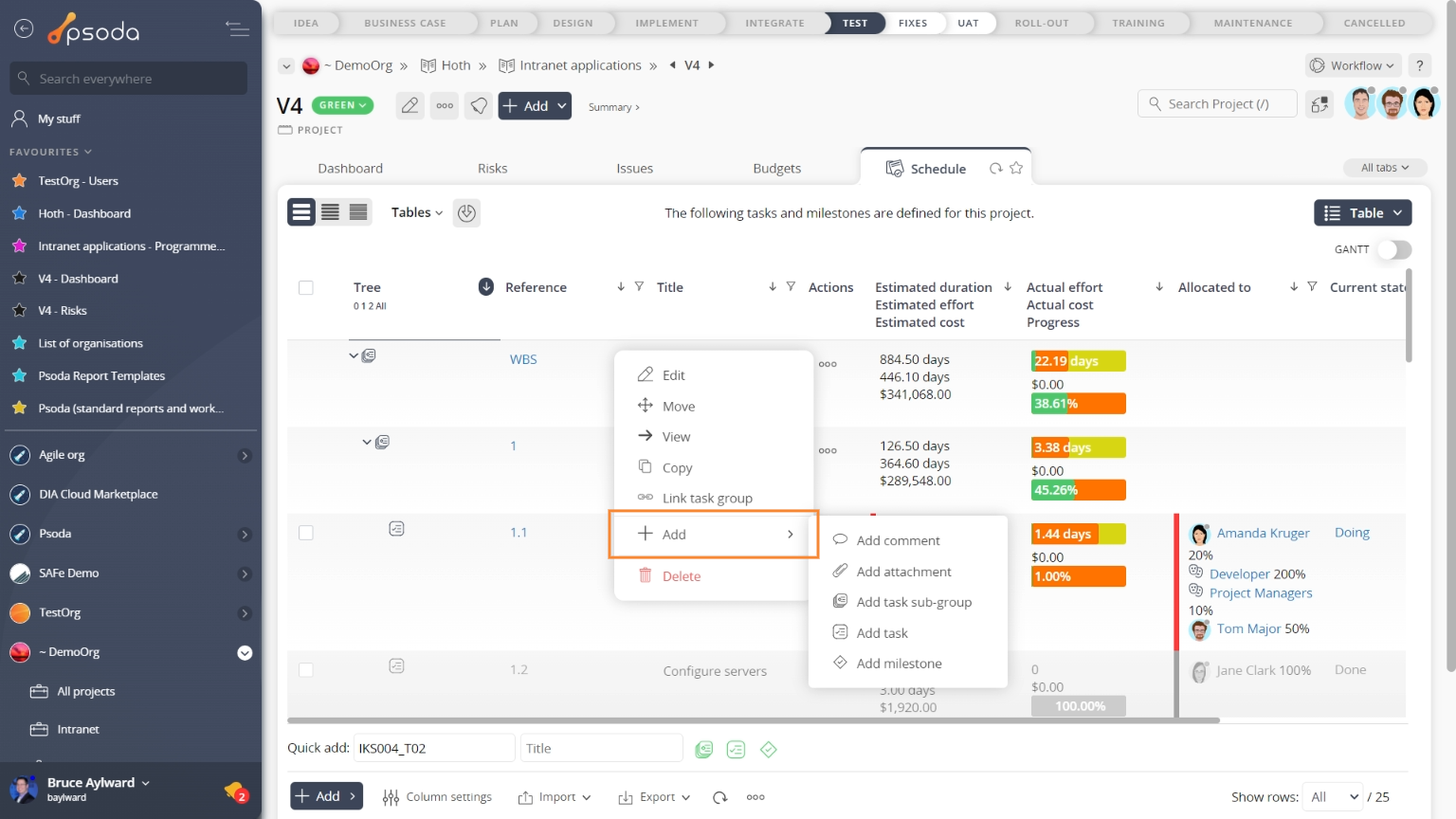 | Estimate type: | Select whether this task is a fixed effort or fixed duration task. If you select Fixed effort then Psoda will calculate the duration for based on the allocation levels. If you select Fixed duration then Psoda will calculate the required effort based on the allocation levels. If you select Advanced estimates then the start date, end date and estimate fields will be hidden, and you can come back and edit these estimates after this task has been created. |