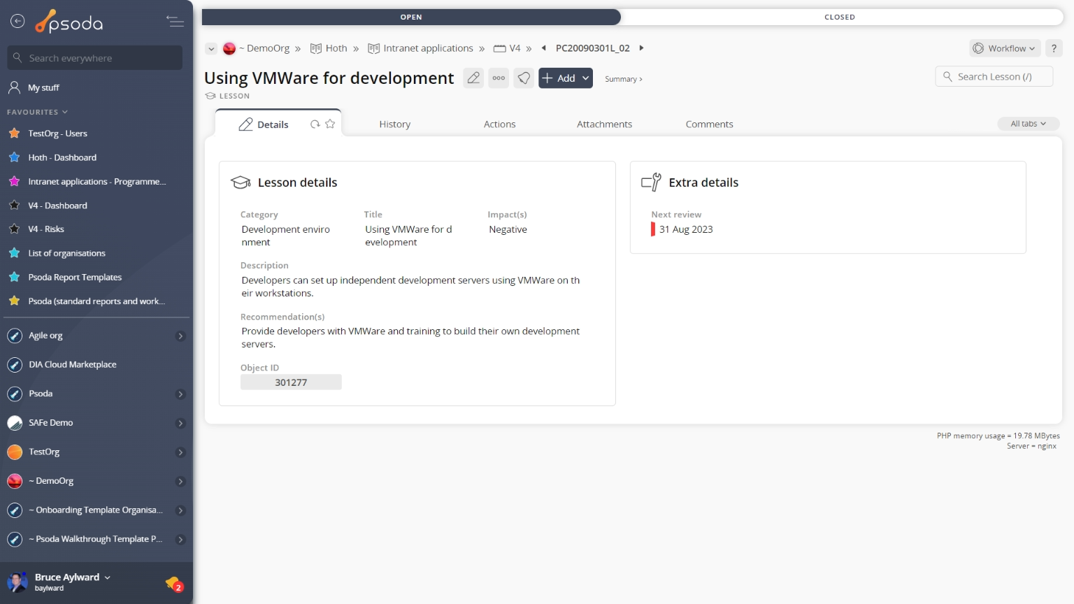 Some details of the risk are displayed in subsections just below the top header area, such as the lesson’s location within Psoda, and it’s category, title and impact. The rest of the page is made up of a number of tabs or sections (depending on your selected view):
