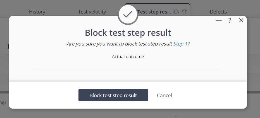 Click on the “Block test step result” button to change the test step result’s status to “Blocked”. Otherwise, click on the “Cancel” button if you no longer want to block this test step result.
