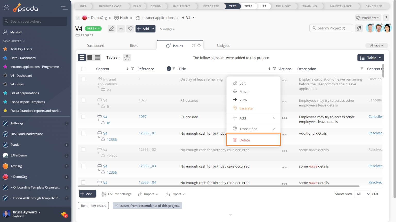 options menu in the top header area, as shown in Figure 1. Alternatively you can access the delete popup form via the issues tabbed view at any of the parent asset view pages (e.g. organisation, programme, project, risk etc), shown in Figure 2.
