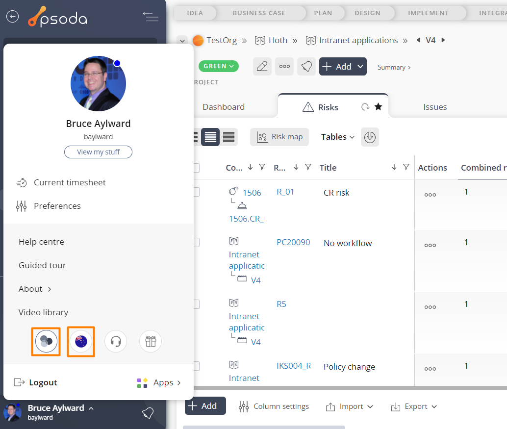 The appearance of your Psoda account can be changed via the language or themes menu which are found in the user menu in the bottom left-hand corner of the page.