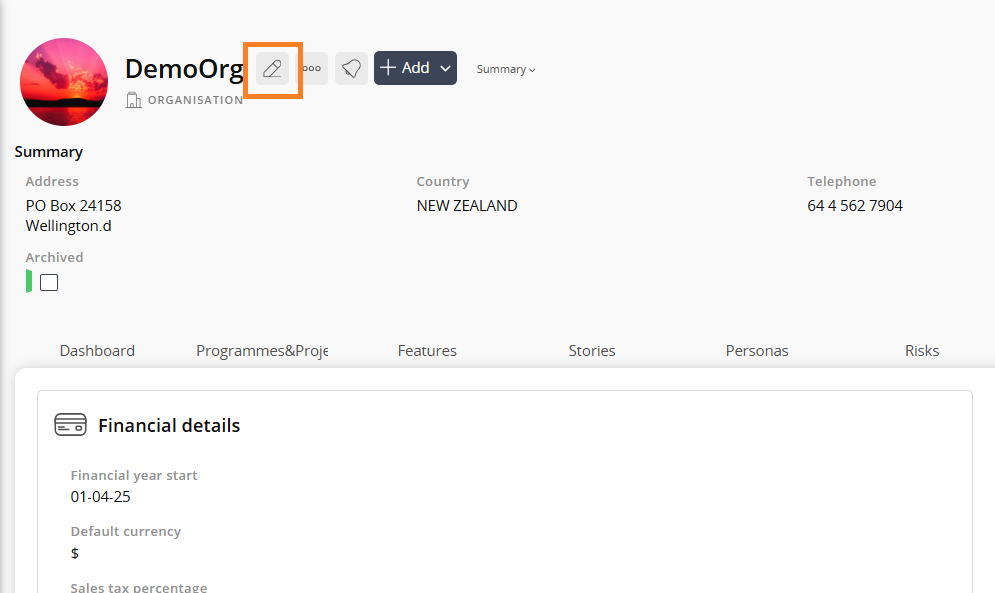 • Click the Edit button on the organisation.