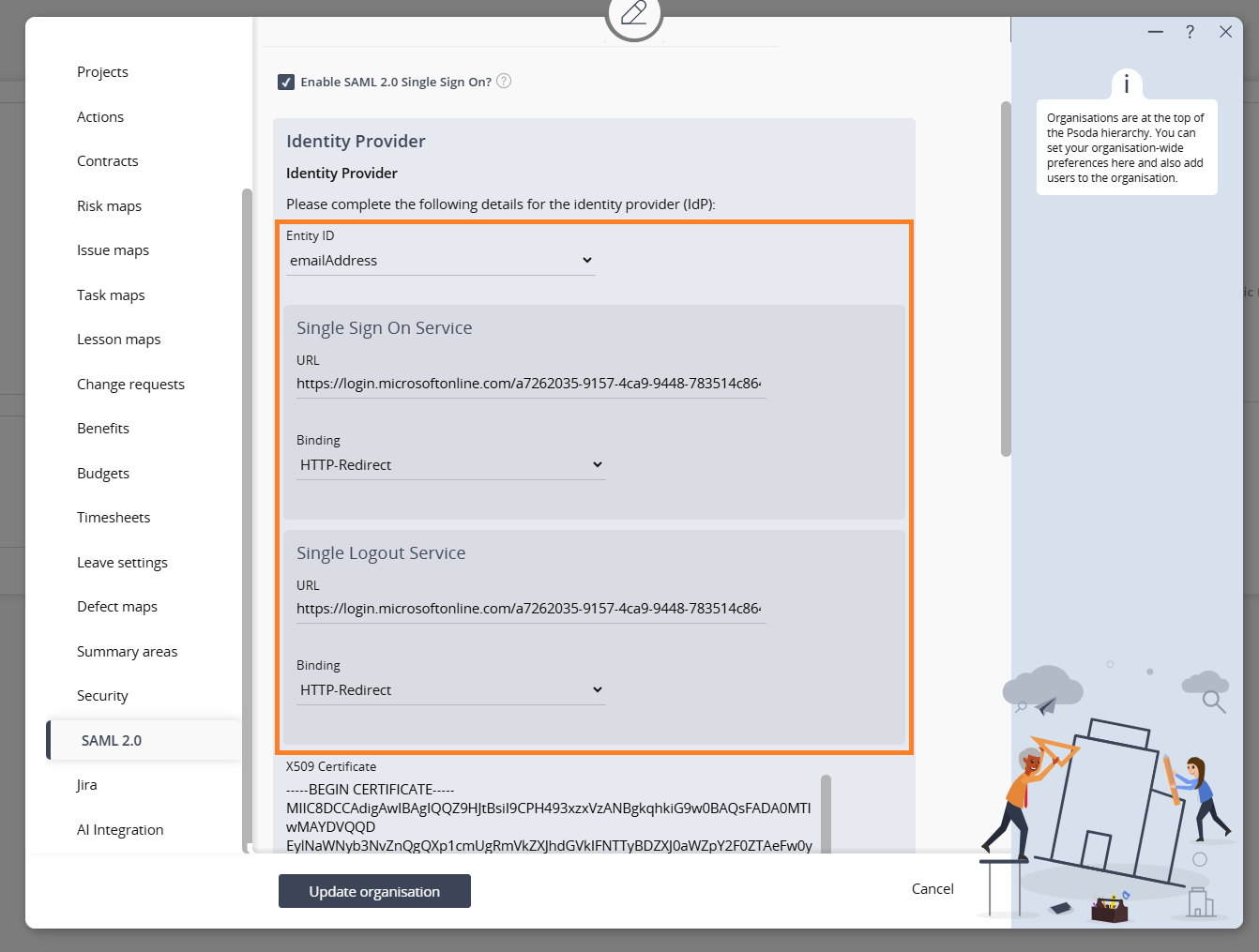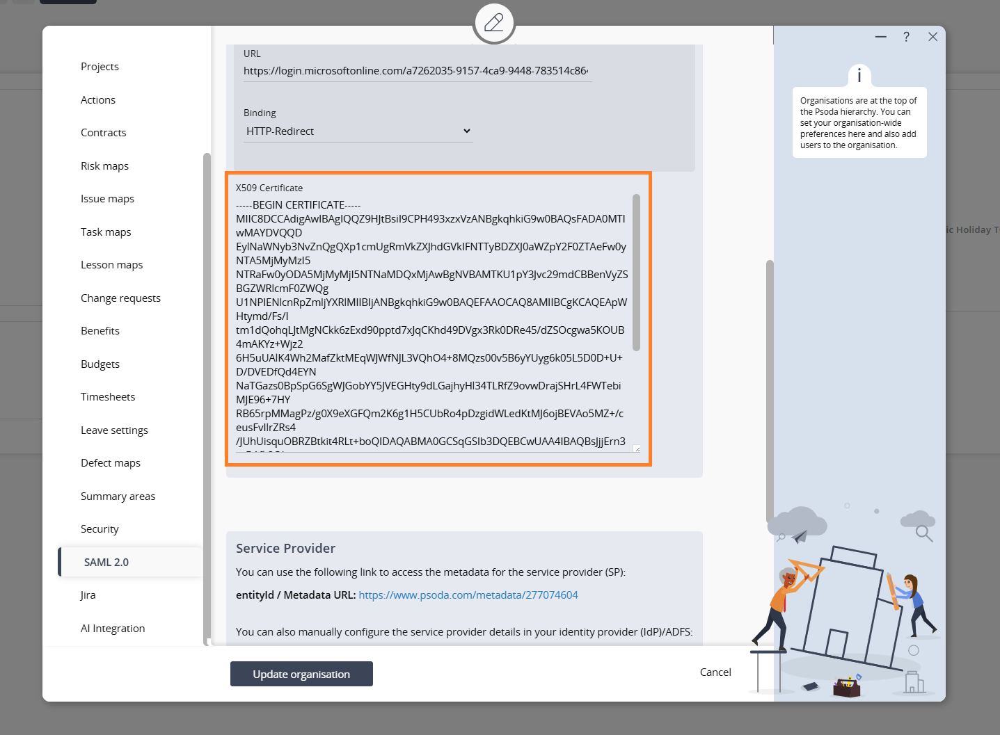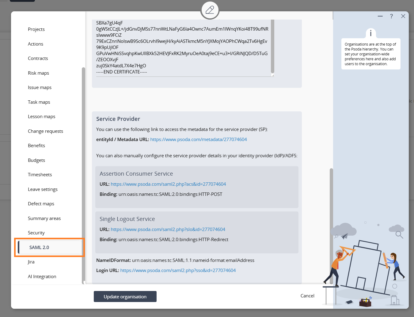 4. Return to Psoda, open the Edit Organisation popup, and go to the SAML 2.0 tab.