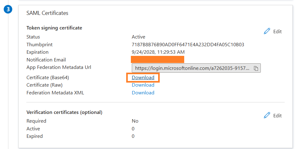 1. In the SAML Certificates section of the Entra portal, click Download next to Certificate (Base64).