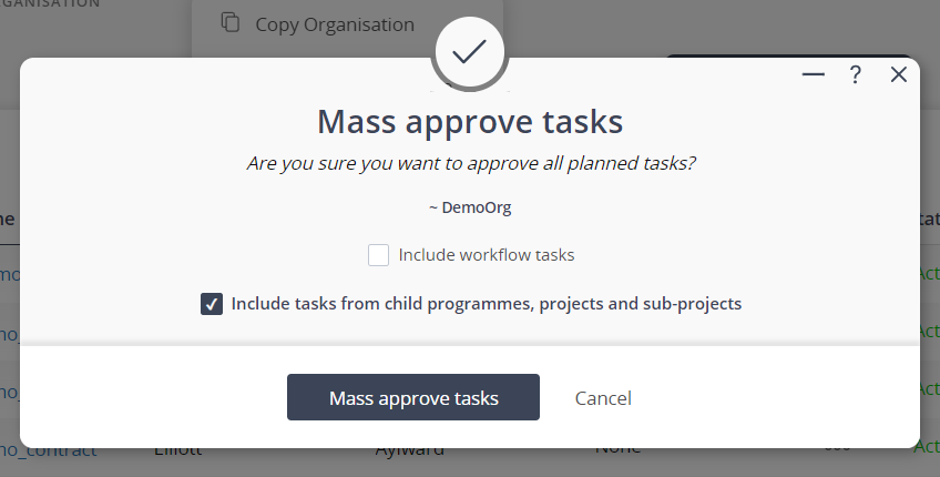 tasks for the selected asset indicated in the read-only field in this popup (in Figure 2, this is the organisation). This includes all tasks within