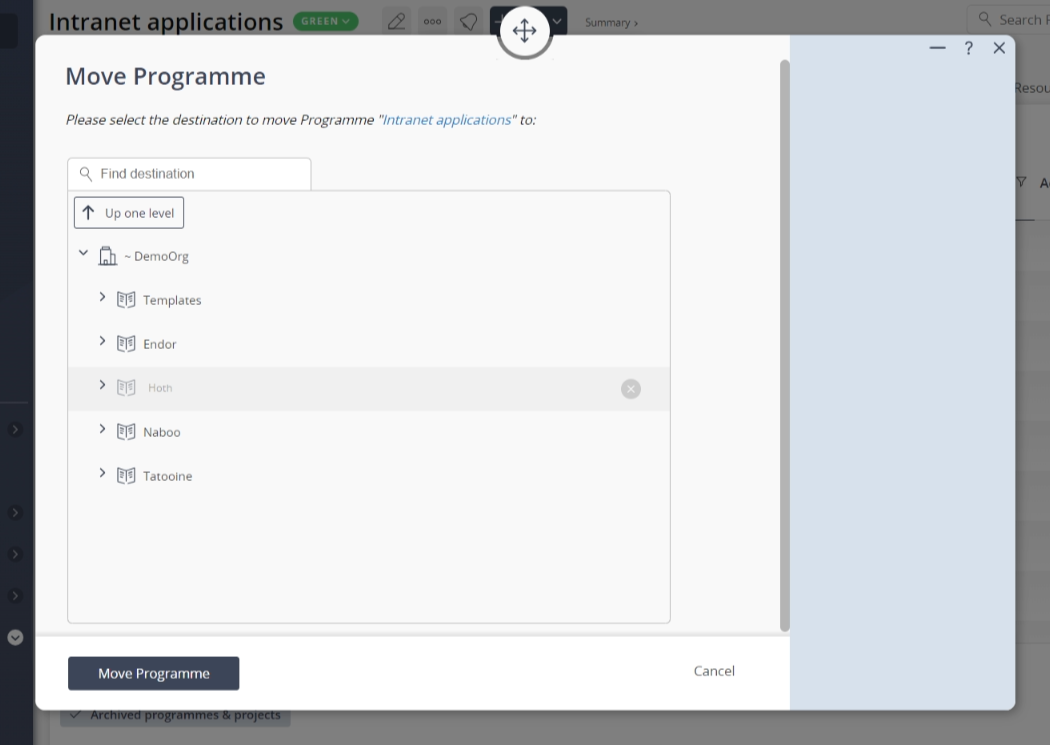 Use the tree navigation layout to select the new parent programme or organisation. You can show or hide levels or sub-levels by clicking on the